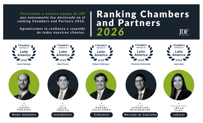 Nos llena de orgullo anunciar que nuevamente hemos sido reconocidos en el ranking de Chambers and Partners Latin America Guide 2026. Destacamos a nuestros socios Rafael Valdivieso, en el área Tributaria; Javier Naranjo, en Medio Ambiente; Julio Trucco , en Inmobiliario; Christian Schiessler, en Mercado de Capitales; y a nuestra asociada del área Laboral, Leyla Alul. Lo anterior, es el resultado de