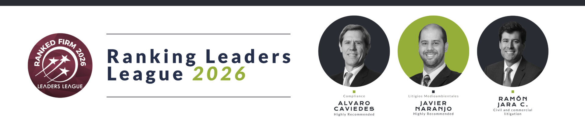 Nuestros socios Alvaro Caviedes, Javier Naranjo y Ramón Jara C. fueron destacados en el ranking Leaders League – Latin America 2026 en las áreas de Compliance, Litigios Medioambientales y Litigios Civiles y Comerciales, respectivamente.